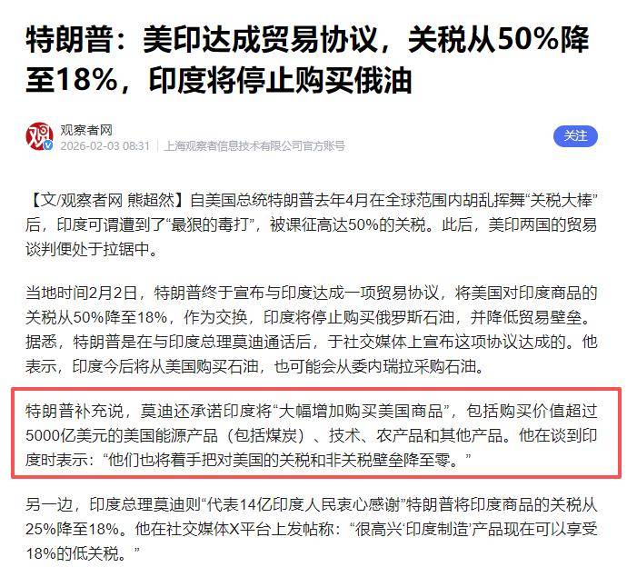 对印度,特朗普直接把关税从原来的50%降到了18%,幅度大得惊人,背后的原因很直白,就在几天前,印度刚跟美国许下承诺,停止购买俄罗斯的石油。