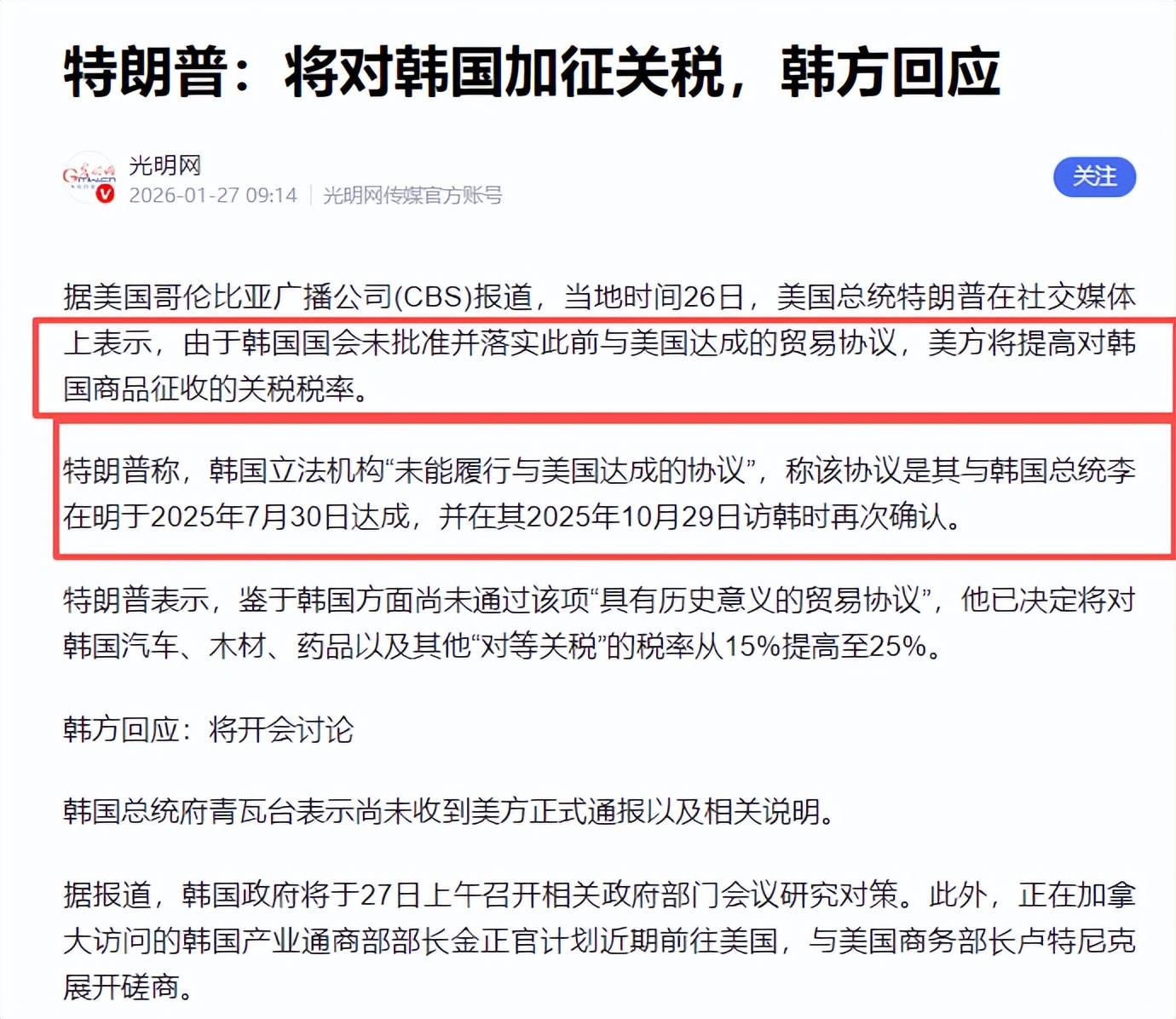 反观韩国,待遇就完全不同了,特朗普把韩国输美商品的关税,从之前的15%提高到了25%,一点情面都没留。