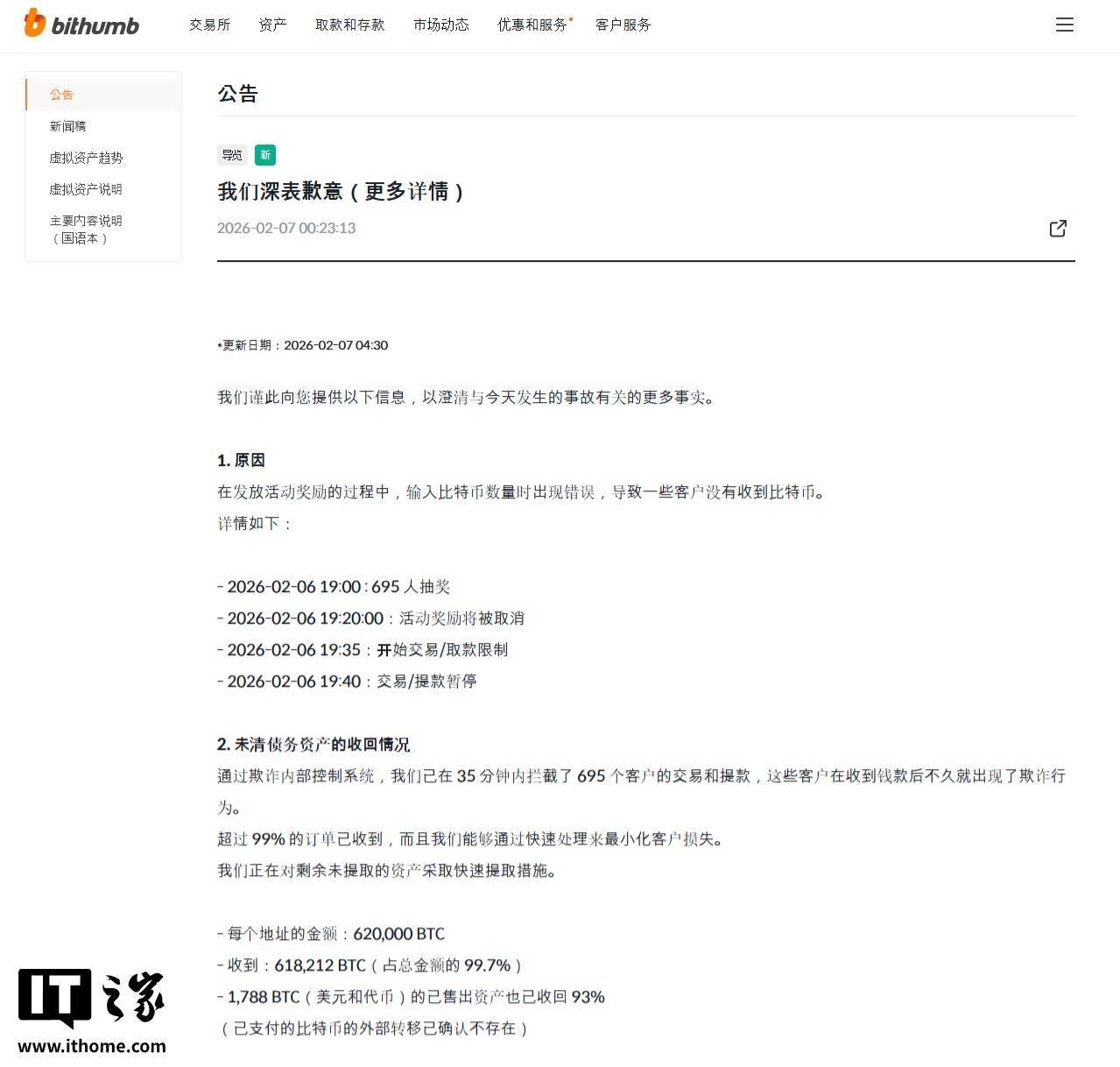 IT之家 2 月 7 日消息,韩国加密货币交易所 Bithumb 今日发布公告,称其在一次促销活动奖励发放过程中操作失误,误向用户发放了总计 62 万枚比特币,按当时价格计算价值超 440 亿美元(现汇率约合 3056.36 亿元人民币)。
