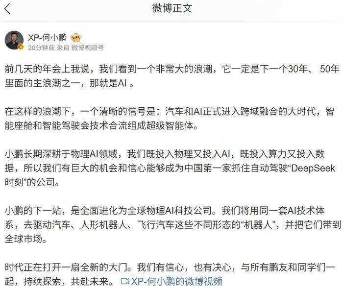 不久前,何小鹏在回顾公司年会时表示,2026 年将被确立为“物理 AI 商业化落地的关键一年”,人工智能将成为未来30至50年的主要技术浪潮之一。他认为,汽车和AI的跨域融合标志着智能座舱和智能驾驶技术的合流,形成超级智能体。