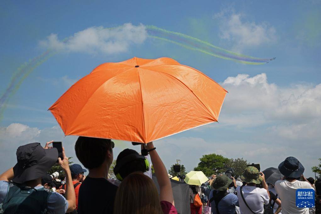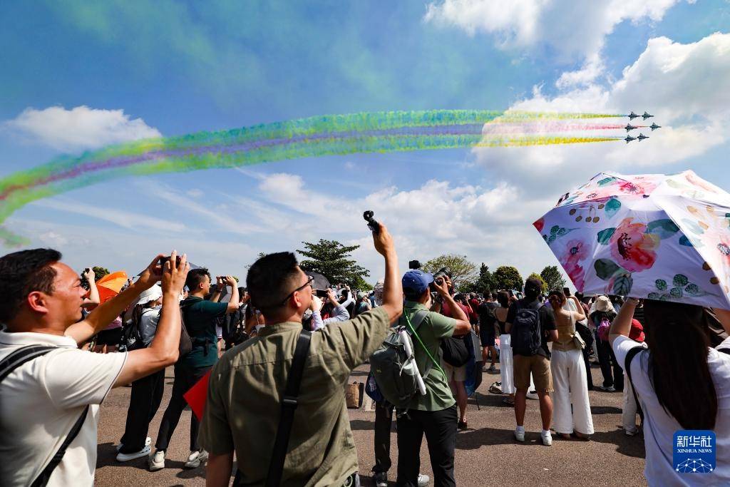 2月7日,在新加坡樟宜展览中心,观众观看中国空军八一飞行表演队的飞行表演。新华社发(邓智炜摄)