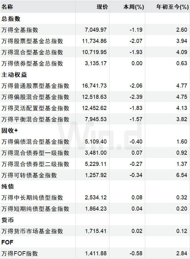最近一周,万得基金指数多数下跌。具体来看,万得全基指数累计跌幅为1.19%,万得股票型基金总指数、万得混合型基金总指数分别下跌2.07%、1.93%。
