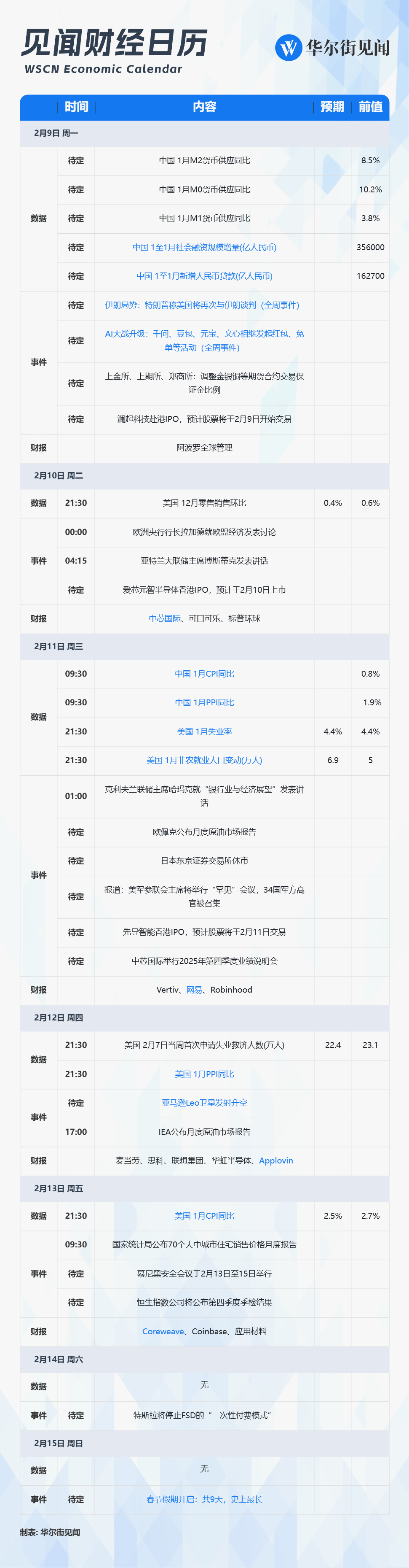 02月09日 - 02月15日当周重磅财经事件一览,以下均为北京时间: