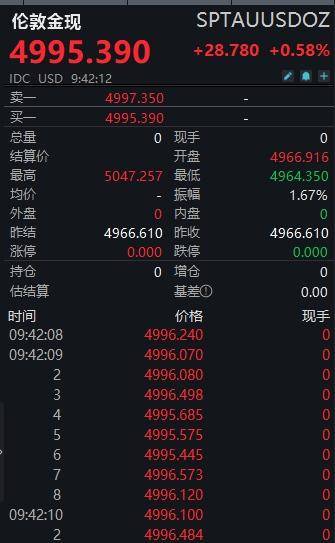 截至发稿时,伦敦金现小幅回落,现报4995.39美元/盎司,涨幅0.58%。沪金方面,截至发稿报1124.78元/克,涨幅3.62%。