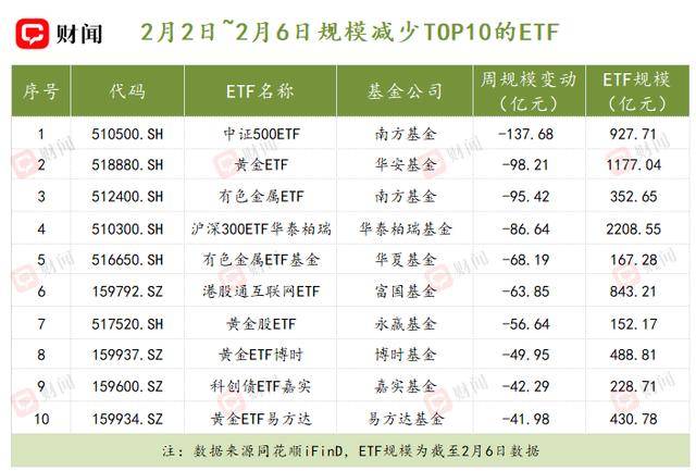 与之相对应的是,宽基ETF和黄金ETF的规模在大幅减少。其中,上周规模下滑最大的是中证500ETF(510500.SH),规模单周蒸发137.68亿元,规模降至927.71亿元,暂别“千亿俱乐部”。上周,华安基金的黄金ETF(518880.SH)也出现了98.21亿元的规模缩水。