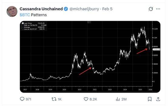 伯里5日在X平台发布了一张比特币价格走势对比图,仅配文 “比特币走势形态”。从图中标注的红色箭头可以看出,比特币眼下从12.6万美元跌至7万美元的走势,与此前从3.5万美元暴跌至2万美元以下的走势高度相似。