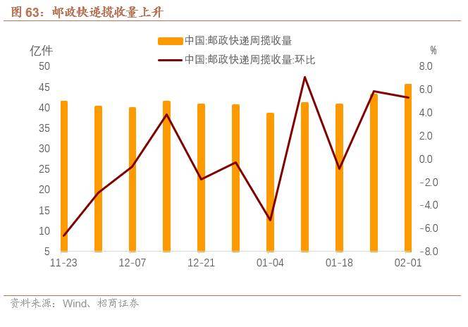 上周邮政快递揽收量45.41亿件,环比上升5.34%。