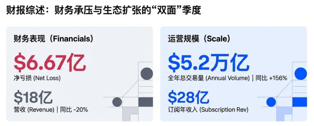 全年总交易量达5.2万亿美元(同比+156%),加密交易量市占率升至6.4%(同比翻倍)。更被管理层视作“穿越周期压舱石”的订阅与服务收入创历史新高至28亿美元,USDC相关收益与会员订阅成为关键支点。