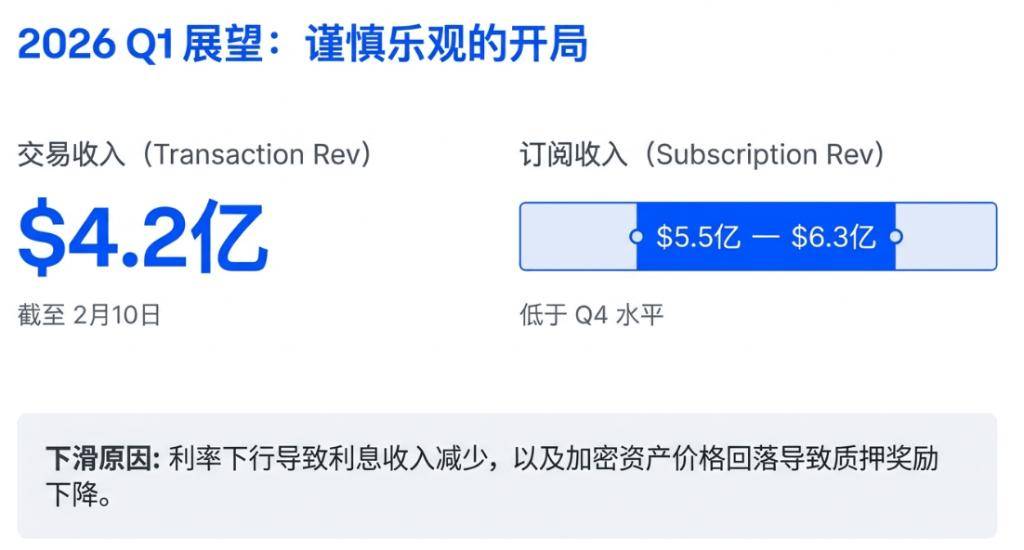 截至2026年2月10日,公司已产生约4.2亿美元的交易收入。但在订阅服务方面,预计Q1收入将在5.5亿至6.3亿美元之间,低于Q4水平,主要原因是利率下行导致的利息收入减少以及加密资产价格回落带来的质押奖励下降。