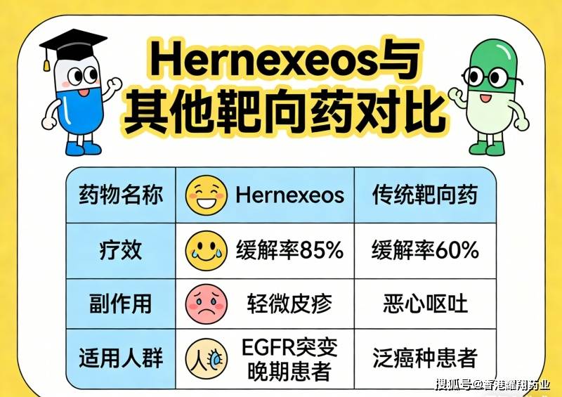 Hernexeos 作为针对特定靶点的靶向药物,与其他靶向药相比,在适用人群、使用方式等方面具备自身特点。 与部分传统靶向药相比,Hernexeos 对特定基因异常的肿瘤细胞具有更精准的抑制作用,更适合对应突变类型的患者。