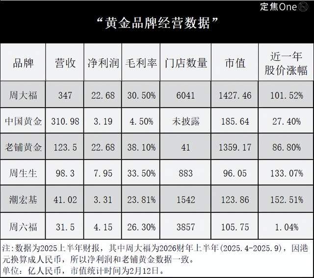 但市场的火热并没有让所有黄金品牌吃到同等红利,我们对比周大福、中国黄金、老铺黄金、周生生、潮宏基、周六福六家已上市企业的财报发现,有的凭借门店规模撑起营收,有的靠品牌溢价赚取高额利润,还有的在高成本压力下已经开始关店收缩。