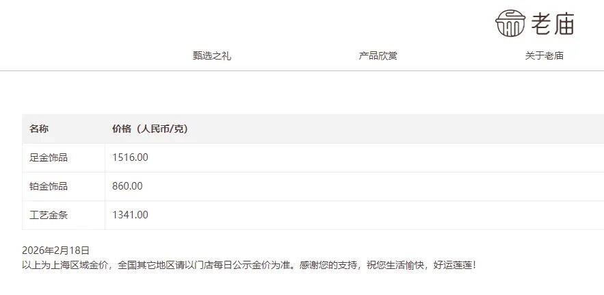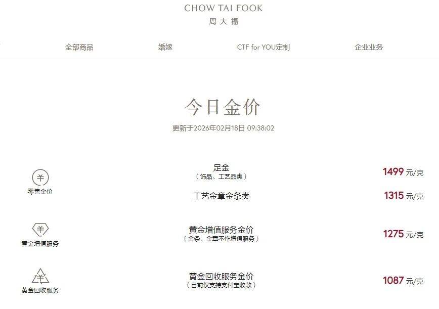 在国内黄金实物方面,北京时间2月18日,国内主流珠宝品牌金饰克价跌破1500元。截至发稿,周大福足金饰品最新价格报1499元/克,老凤祥报1510元/克,周生生报1509元/克,老庙报1516元/克。