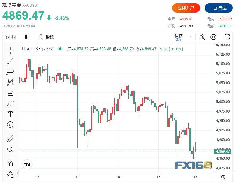 美市盘中,现货黄金下跌超2.5%,一度触及4840.02美元/盎司低点