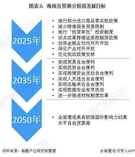 2020年6月1日,中共中央、国务院印发了《海南自由贸易港建设总体方案》,文件指出,海南是我国最大的经济特区,具有实施全面深化改革和试验最高水平开放政策的独特优势,中央将大力支持海南逐步探索、稳步推进中国特色自由贸易港建设,分步骤、分阶段建立自由贸易港政策和制度体系。《方案》中明确,到2025年,海南岛将初步建立以贸易自由便利和投资自由便利为重点的自由贸易港政策制度体系;到2035年,实现贸易自由便利、投资自由便利、跨境资金流动自由便利、人员进出自由便利、运输来往自由便利和数据安全有序流动;到21世纪中叶,全面建成具有较强国际影响力的高水平自由贸易港。