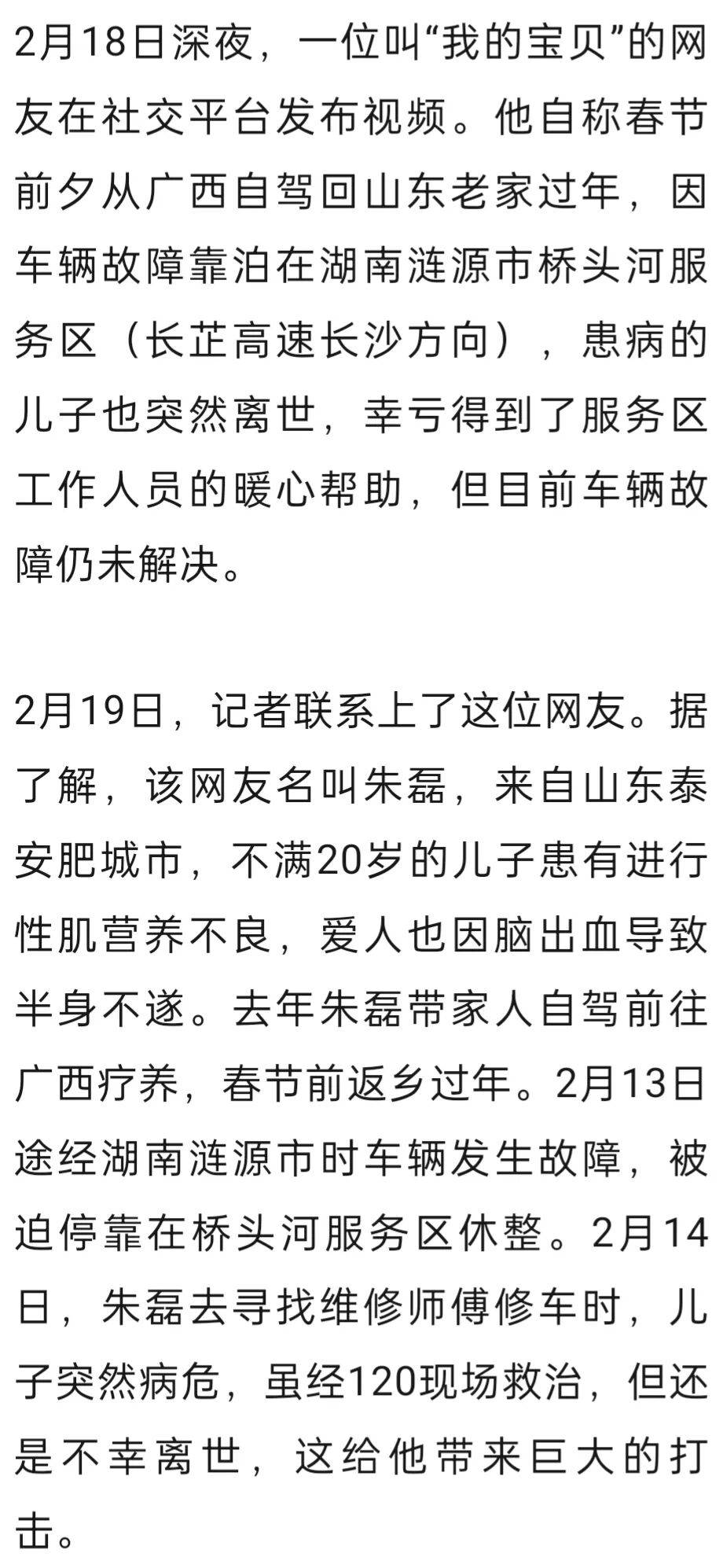 1家3口春节返乡途中突生变故:车辆抛锚,患病儿子离世,湖南一服务区暖心帮助,送菜送水果还捐款