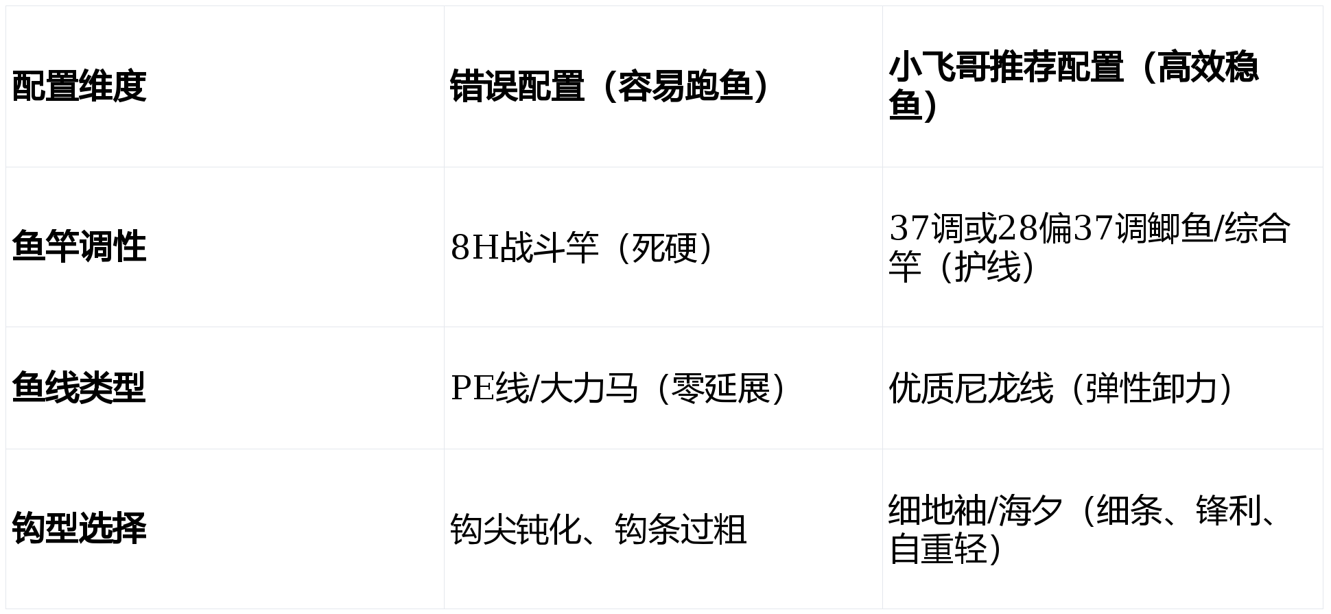 那么,要想无刺钩不跑鱼,我们应该怎么配置?记住小飞哥的“黄金三角”原则:竿软、线韧、钩锋利
