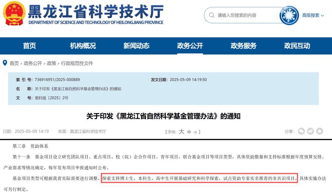 其实,2025年最新修订的《黑龙江省自然科学基金管理办法》,已明确“探索支持博士生、本科生、高中生开展基础研究和科学探索”。具体的实施办法将另行制定。