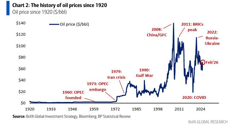 因此,Hartnett给出的策略格言言简意赅:“利用地缘政治震荡 = 交易石油(Trade Oil),持有黄金(Own Gold)。”