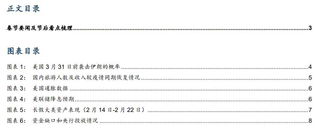 今年春节时间晚+假期长,春节期间出行数据偏强,IEEPA关税裁决与中东地缘局势升温扰动风险偏好,AI竞赛加速演绎,美国经济韧性带动降息预期回落。资产层面,春节期间原油、韩股、欧股、贵金属领涨,恒指、非美货币、比特币等表现偏弱。春节后紧邻全国两会,且地缘及大类资产表现仍具不确定性。我们将结合春节期间的相关动态及最新数据与市场变化,系统梳理节后市场核心关注点,并给出后续资产走势判断及操作建议。