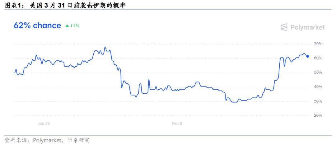 第三,美伊局势升温压制全球风险偏好,目前仍处于高度紧张状态,谈判与军事施压并行,冲突风险依然存在,分歧在烈度上。2月17日,美伊第二轮谈判无果而终,对于核心问题仍存在较大分歧。特朗普公开宣布给伊朗10-15天的谈判最后期限,称若不达成协议,将考虑军事打击。根据Polymarket数据,截至2月21日,美国3月15日前袭击伊朗的概率上升至50%,3月31日前袭击概率上升至62%。地缘局势升温引发原油供给紧张担忧,叠加EIA库存意外锐减,布伦特原油高位上行,上周涨5.62%,至71美元/桶。
