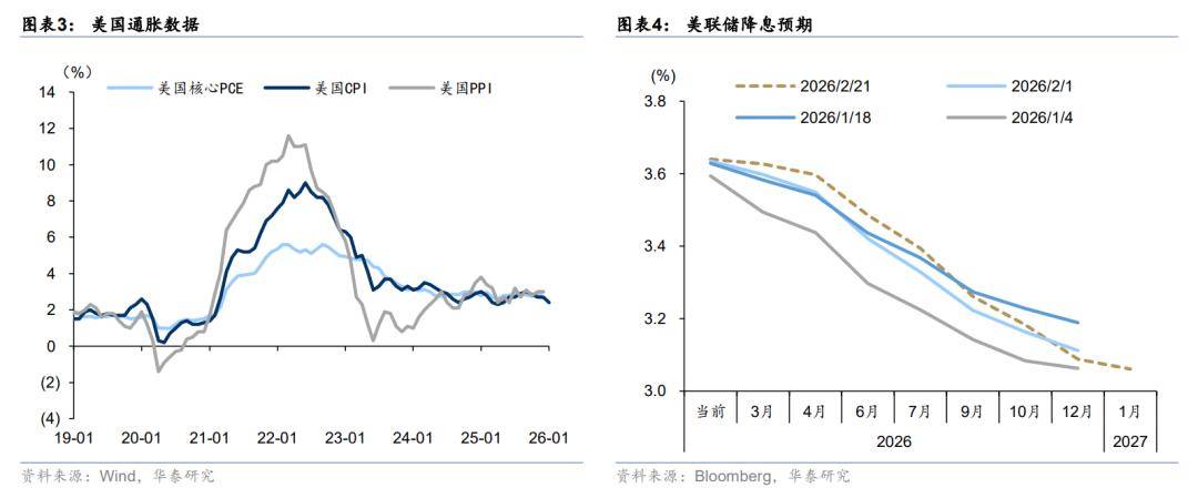 二是,美联储1月FOMC会议再现分歧,市场担心降息节奏可能有变。2月18日美联储1月FOMC会议内容显示,几乎所有官员赞同维持利率在3.5%-3.75%不变,但纪要中首次出现官员讨论“重启加息”的可能性,三种立场(支持降息、坚持暂停、不排除加息)罕见同时出现,同时3月降息概率进一步下降、首次降息窗口或推迟至年中。当然,后续还要看新美联储主席政策主张及实际操作。我们认为,目前美联储整体仍处于“按兵不动”的观察期,今年美联储降息的大方向不改,但短期扰动将会加大。对A股的影响主要体现在外资流向和汇率层面,间接影响北向资金流入意愿。