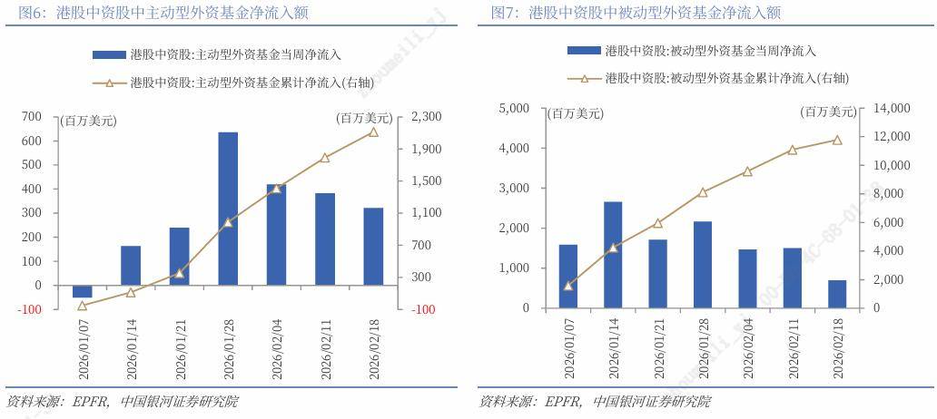 外资方面,截至2月18日的近7天,港股中资股中,全球主动型外资基金净流入3.21亿美元,全球被动型外资基金净流入6.97亿美元,分别较上周净流入额减少0.62亿美元、8.05亿美元。