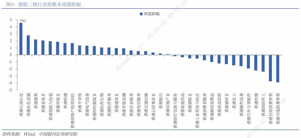 港股一级行业中,本周8个行业上涨,3个行业下跌。其中,能源、材料、工业行业指数涨幅居前,分别上涨3.65%、2.27%、1.03%;可选消费、日常消费、通讯服务行业指数跌幅居前,分别下跌1.86%、1.50%、0.13%。从二级行业来看,本周石油石化、有色金属、建筑、家电、造纸与包装行业指数涨幅居前,可选消费零售、日常消费零售、国防军工、传媒、汽车与零配件行业指数跌幅居前。
