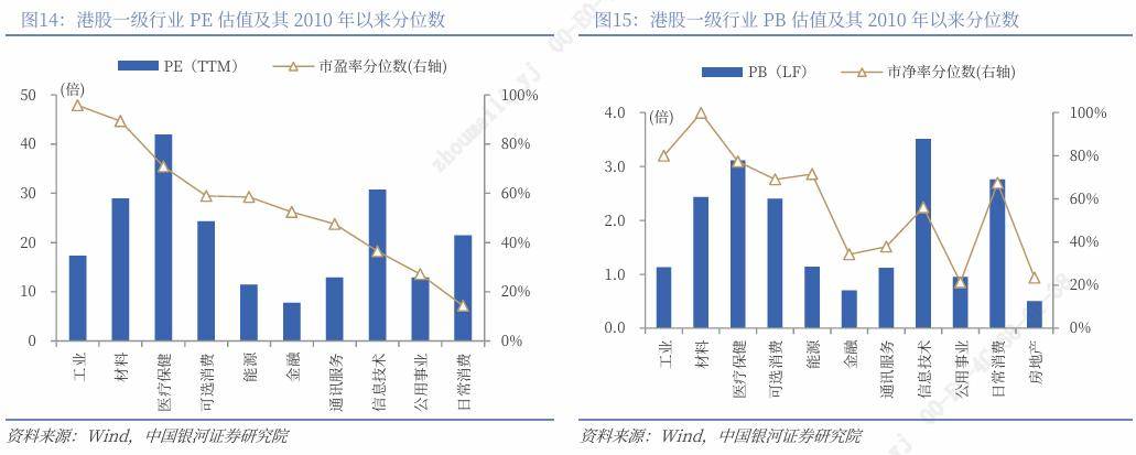 行业估值方面,截至2026年2月20日,港股一级行业估值分化较大。日常消费、公用事业、信息技术、通讯服务的PE估值均处于2010年以来50%分位数以下,处于历史中低水平;除房地产外,其余行业的PE估值均处于2010年以来50%分位数水平以上。