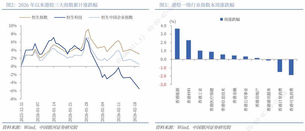 本周港股行情表现:(1)本周(2月16日至2月20日),全球主要股指多数上涨。其中,受春节假期影响,港股仅周一、周五两个交易日开盘,港股三大指数震荡下跌,恒生指数下跌0.58%,恒生科技指数下跌2.78%,恒生中国企业指数下跌0.81%。(2)港股行业层面:一级行业中,本周8个行业上涨,3个行业下跌。其中,能源、材料、工业行业指数涨幅居前,分别上涨3.65%、2.27%、1.03%;可选消费、日常消费、通讯服务行业指数跌幅居前,分别下跌1.86%、1.50%、0.13%。从二级行业来看,本周石油石化、有色金属、建筑、家电、造纸与包装行业指数涨幅居前,可选消费零售、日常消费零售、国防军工、传媒、汽车与零配件行业指数跌幅居前。