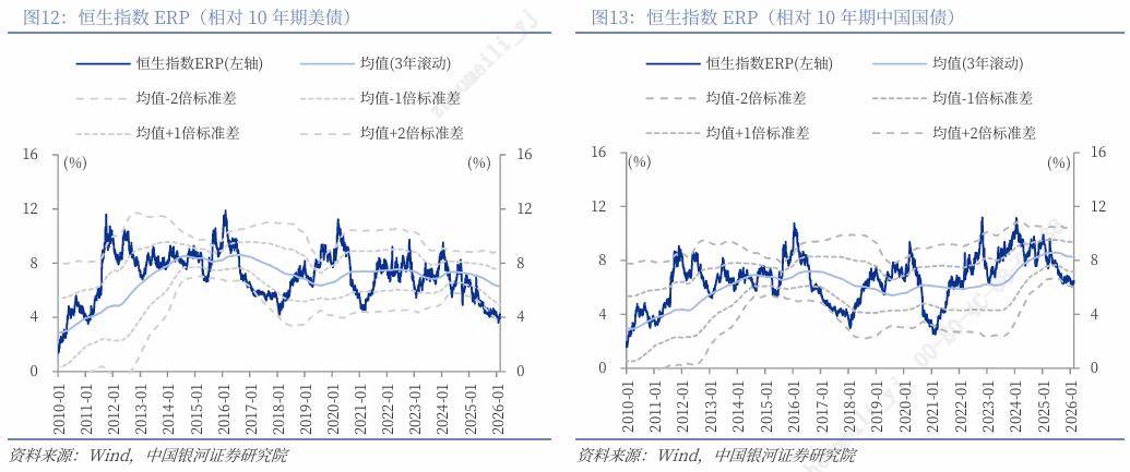 截至2026年2月20日,10年期中国国债到期收益率为1.7899%,从而港股恒生指数的风险溢价率(1/恒生指数PE-10年期中国国债到期收益率)为6.48%,为均值(3年滚动)-1.58倍标准差,处于2010年以来42%分位。