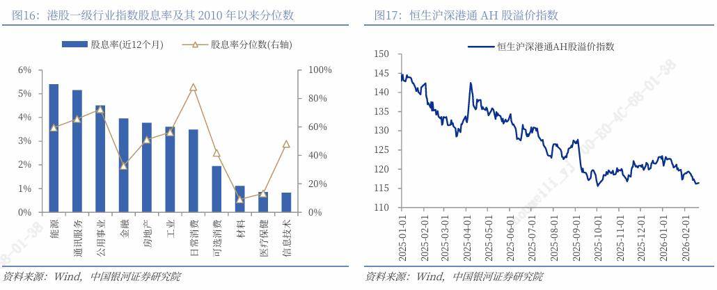 港股估值与风险偏好:(1)截至2026年2月20日,恒生指数的PE、PB分别为12.09倍、1.23倍,分别处于2010年以来79%、55%分位数水平。(2)10年期美国国债到期收益率较上周五上行4BP至4.08%,港股恒生指数的风险溢价率为4.19%,处于2010年以来5%分位。10年期中国国债到期收益率为1.7899%,从而港股恒生指数的风险溢价率为6.48%,处于2010年以来42%分位。(3)恒生沪深港通AH股溢价指数较上周五下降1.02点至116.40,处于2014年以来9%分位数的水平。