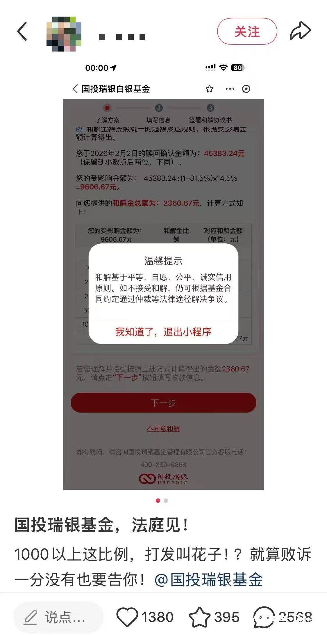 还有一位估值调整影响金额近1万元的投资者,在社交平台直言不满称1000元以上的补偿比例“如同打发叫花子”,并表示“即便败诉一分钱拿不到,也要通过法律途径维权”。