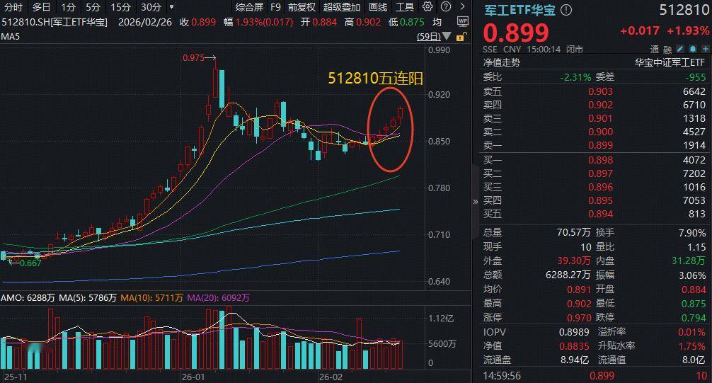 军工,强势续涨!军工板块盘初V字翻红后持续走高,高人气军工ETF华宝(512810)午后上探2.27%,收涨1.93%,全天振幅超3%,日线豪取五连阳。