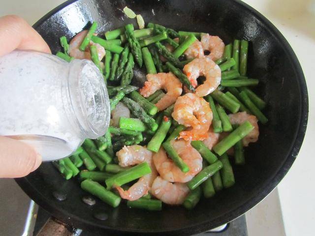4. 加入焯好的芦笋段放进锅中翻炒几下, 最后加入少许盐调味,翻炒均匀即可。