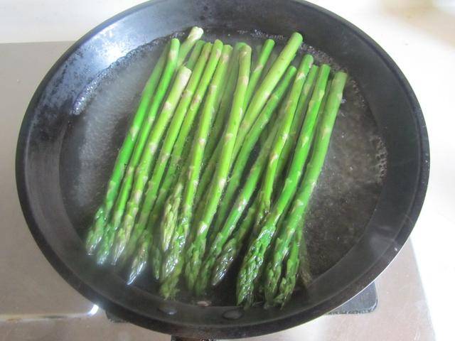 2. 烧锅水加入少许盐和几滴油,将整根芦笋放进锅中焯烫变色后捞出后切成小段,整根芦笋焯水能避免营养的流失;