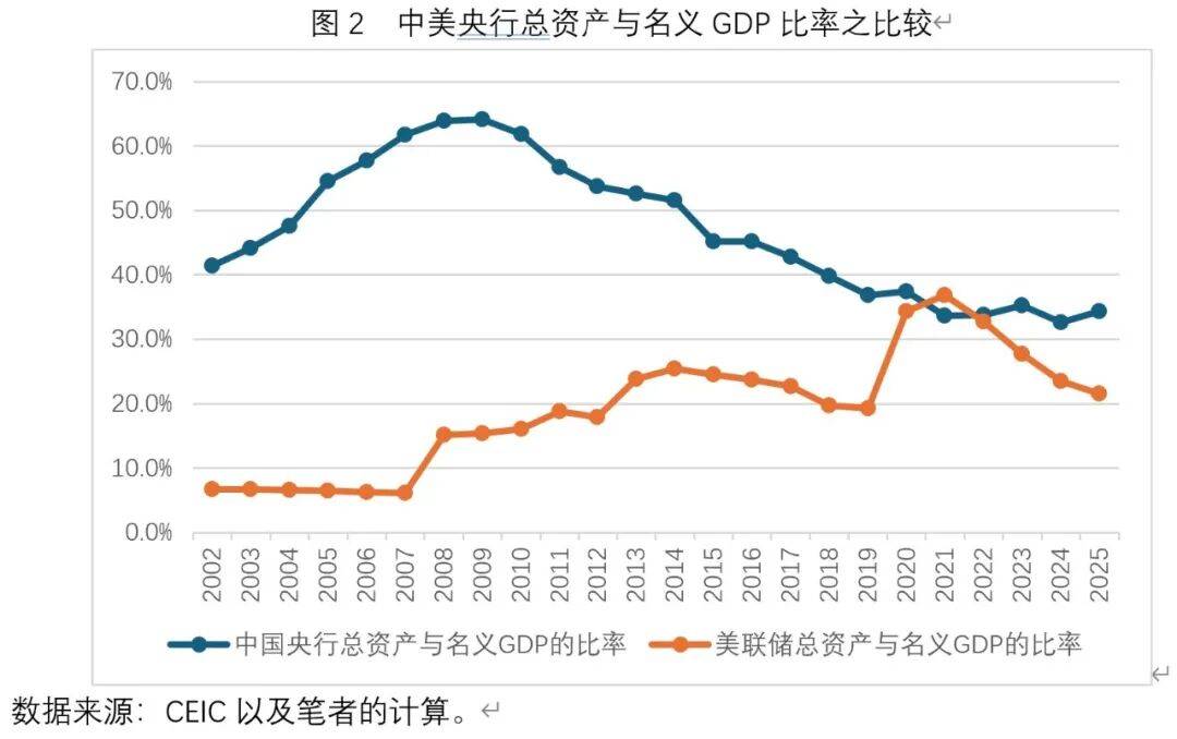 中国央行总资产从2002年底的5.11万亿元上升至2025年底的48.16万亿元,总体上呈现波动中上升态势。不过,中国央行总资产占名义GDP的比率却呈现出先升后降的态势(图1)。2002年底至2009年底,该比率由41.4%上升至64.2%的历史性峰值。2009底年至2025年底,该比率由64.2%下降至34.4%。
