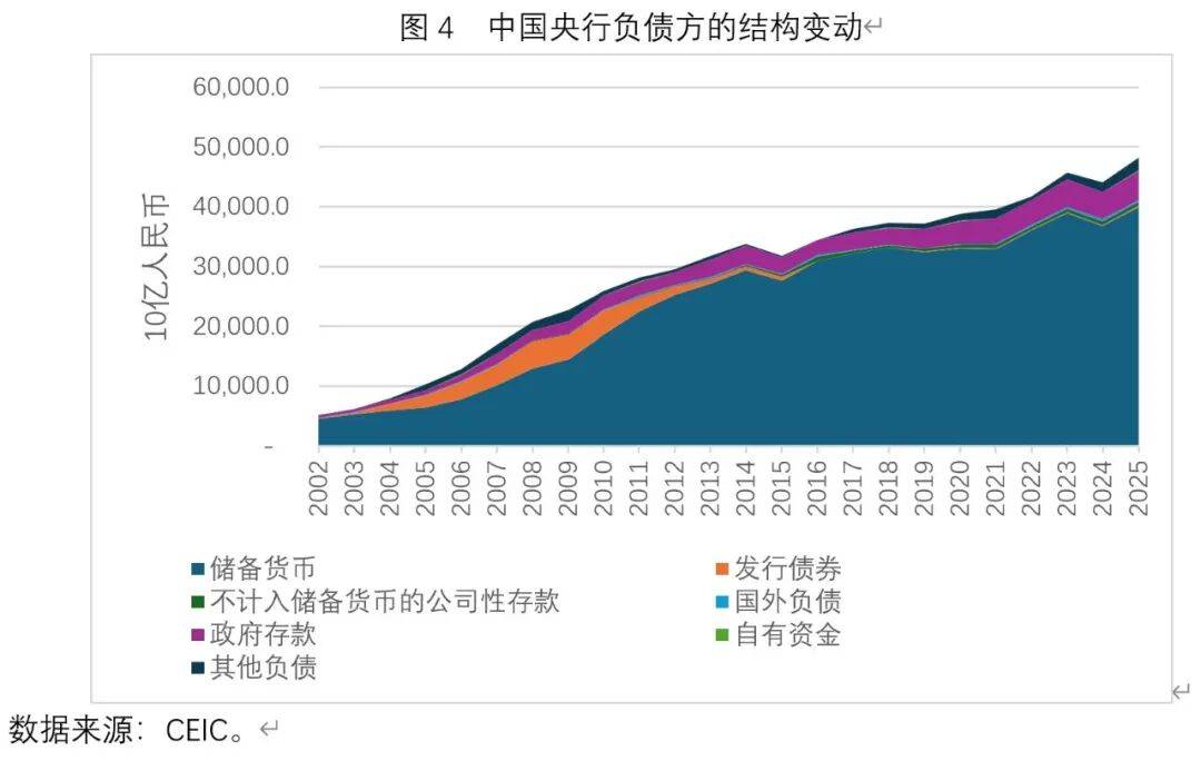 图4反映了中国央行负债方的结构性变动。目前在央行负债中,最重要的是储备货币、其次是政府存款。截至2025年底,储备货币与政府存款分别为39.92万亿元与5.00万亿元,分别占央行总负债的82.9%与10.4%。值得注意的是,央行票据的规模在2008年至2010年均超过4万亿元,并在2008年底达到4.58万亿元的历史性峰值。如前所述,在那段时期内,发行央行票据是中国央行进行冲销的主要方式。但随着冲销规模的上升,央行票据的利率将会水涨船高,而这会加大央行的冲销成本。因此,随后中国央行开始将提高法定存款准备金率作为冲销的主要手段,央行票据逐渐淡出。