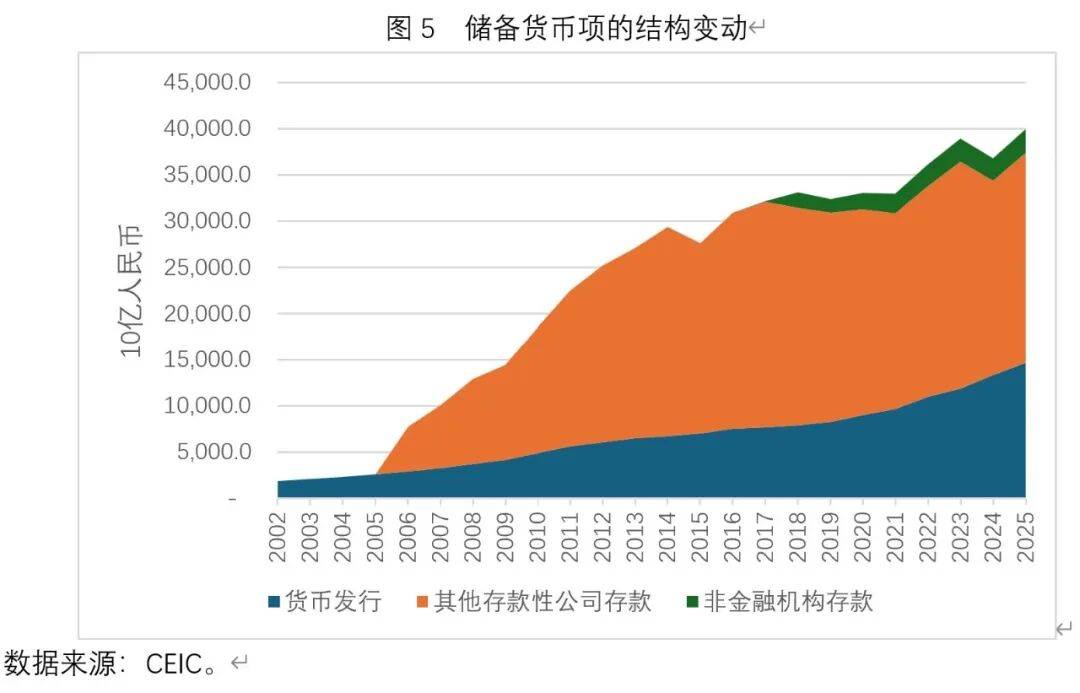 目前在储备货币项中,占据规模最大的是其他存款性公司存款(图5)。截至2025年底,其他存款性公司存款、货币发行的规模分别为22.77万亿元与14.63万亿元。虽然近年来中国央行不断下调法定存款准备金率,但由于企业部门贷款意愿较低,以及商业银行体系对某些行业贷款意愿不强,导致超额存款准备金率然保持在高位。这是其他存款性公司存款项绝对规模并未显著下降的重要原因。例如,其他存款性公司存款项在2023年底达到24.57万亿元的历史性峰值,但到2025年底仅下降了7.3%。
