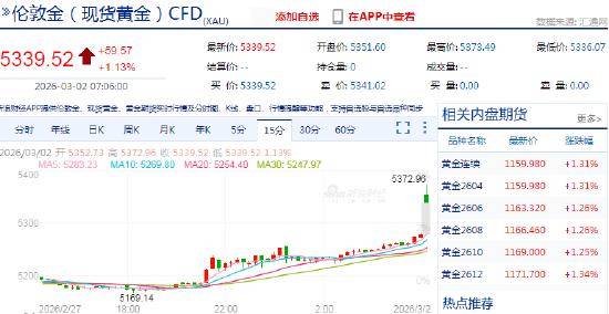3月2日,受中东局势升级影响,避险情绪升温,周一金银全线高开。现货黄金上涨至5372美元/盎司,涨幅1.8%;现货白银报96美元/盎司,涨幅2.6%。