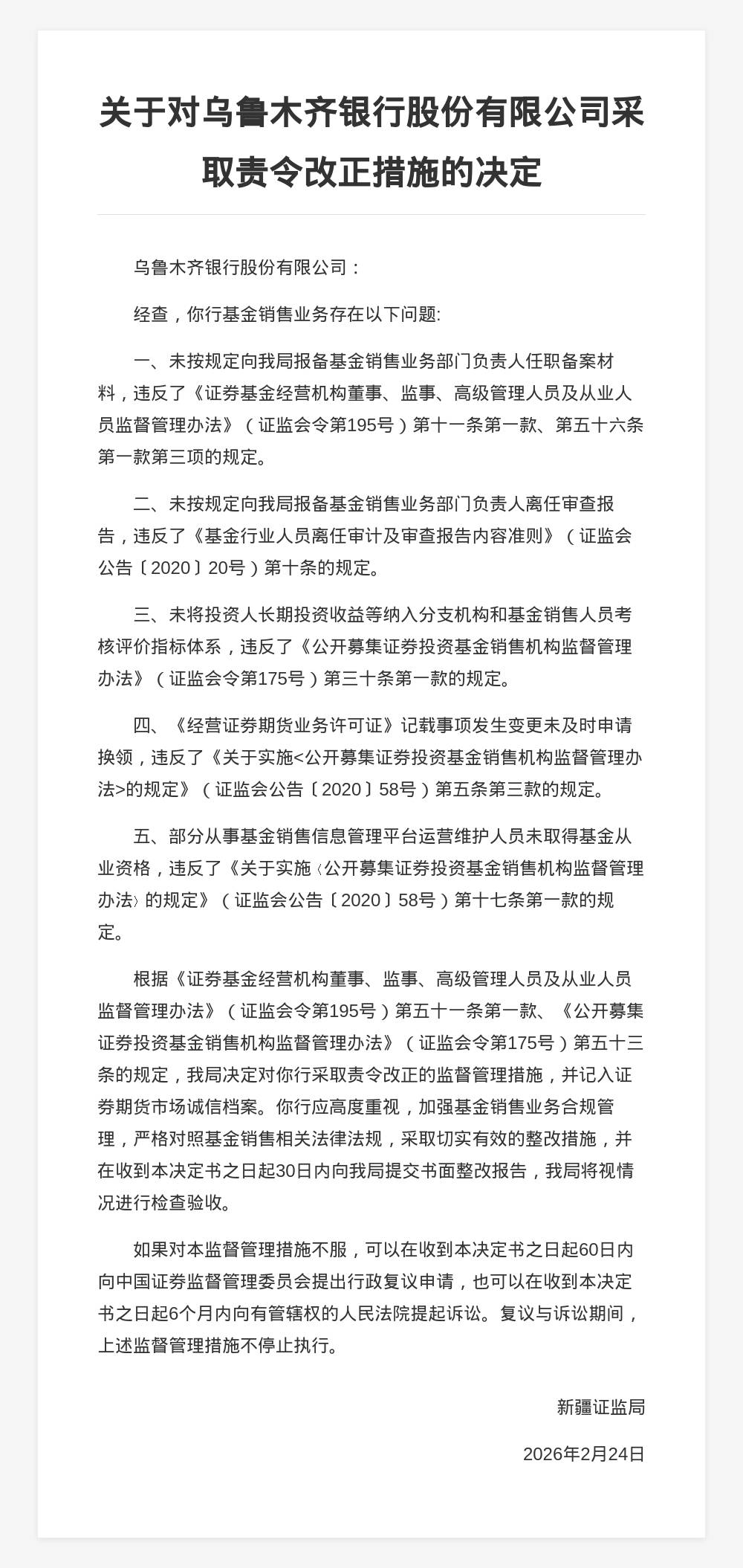 以上行为违反了《证券基金经营机构董事、监事、高级管理人员及从业人员监督管理办法》《基金行业人员离任审计及审查报告内容准则》《公开募集证券投资基金销售机构监督管理办法》《关于实施的规定》的相关规定。新疆证监局决定对乌鲁木齐银行采取责令改正的监督管理措施,并记入证券期货市场诚信档案。