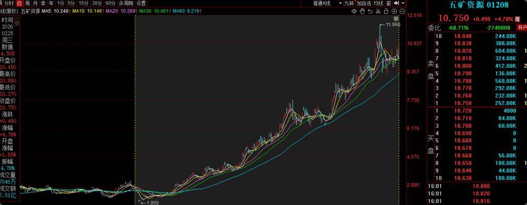 笔者发现,该基金在2025年2季度买入33.98万股的五矿资源,2025年3季度持有206.38万股,2025年4季度持有798.78万股。在基金持有期间,在2025年4月1日-2026年2月27日股票价格上涨了300%。