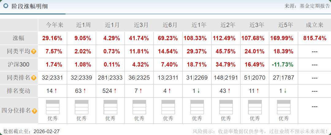 2025年1季度持有1,180.92万股,2025年2季度持有1,094.21万股,2025年3季度持有1,183.48万股,2025年4季度持有1,529.20万股。然而,在该基金持有期间,在2023年4月3日-2026年2月27日股票价格上涨了158%。