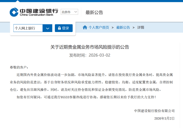 中国建设银行于3月2日提示,近期国内外贵金属价格波动进一步加剧,市场风险显著提升。请您在投资我行贵金属业务时,提高贵金属业务的风险防范意识,基于自身财务状况和风险承受能力理性、稳健投资,均衡、适度配置贵金属,合理控制仓位,避免盲目跟风操作。同时,请及时关注持仓情况和保证金余额变化情况,防范贵金属市场风险。