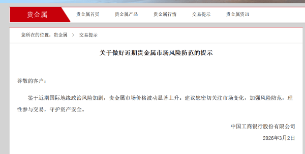 中国工商银行同日提示,鉴于近期国际地缘政治风险加剧,贵金属市场价格波动显著上升。建议您密切关注市场变化,加强风险防范,理性参与交易,守护资产安全。
