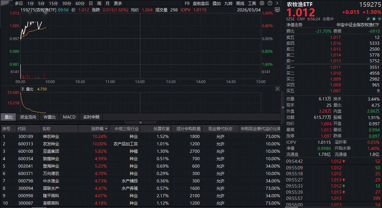 农牧渔板块今日(3月4日)逆市猛拉,全市场唯一农牧渔ETF(159275)开盘后迅速冲高,截至发稿,场内价格大涨1.5%。
