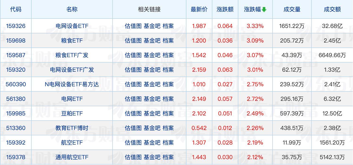 ETF涨跌幅方面,电网设备、粮食相关ETF涨超3%。