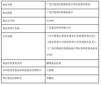 中国经济网北京3月5日讯 今日,广发基金公告,李耀柱离任广发沪港深龙头、广发沪港深价值精选混合。