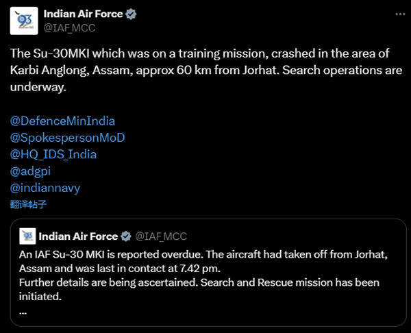 当天早些时候,印度空军曾发文称,一架从乔尔哈特起飞的苏-30MKI战机失联,最后一次联系时间为当天晚间7点42分。