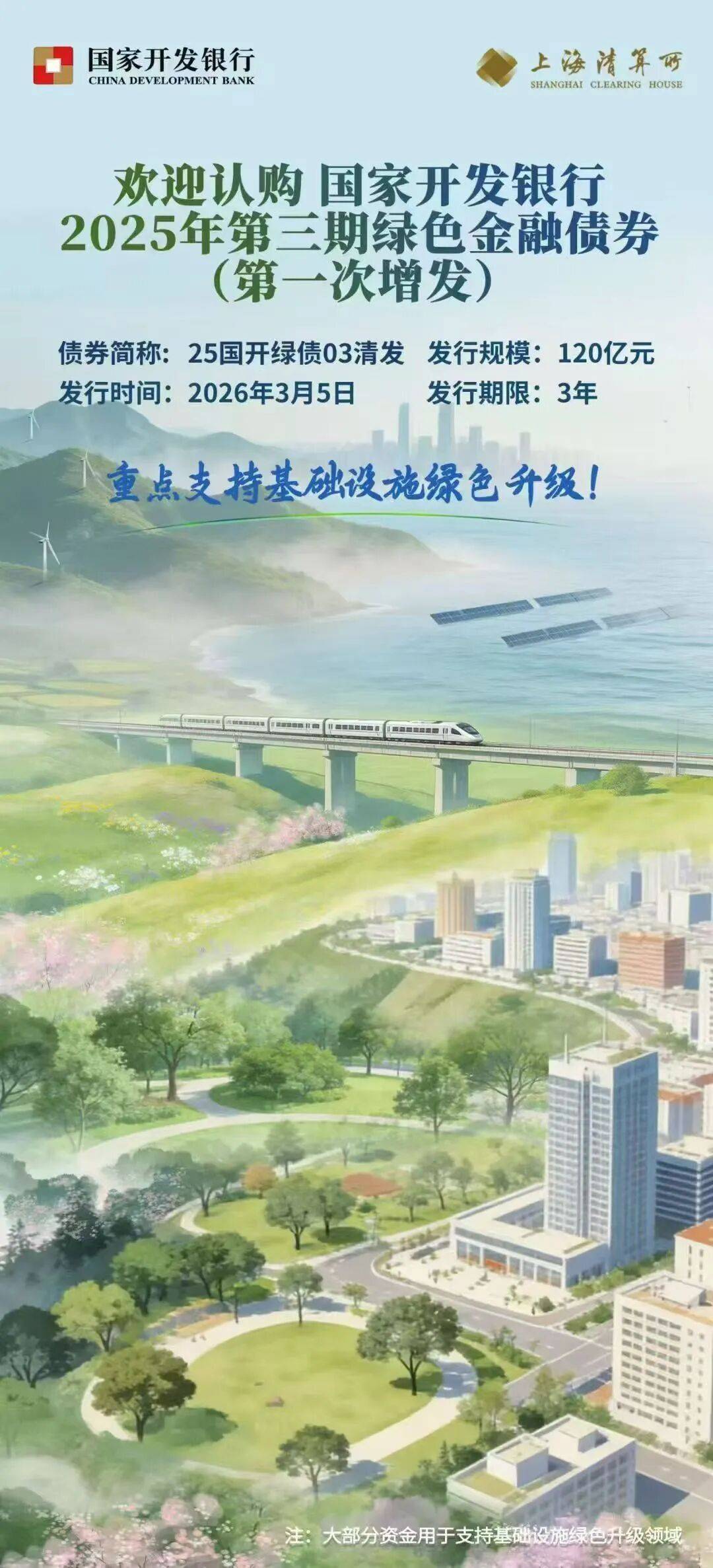 【大河财立方消息】据国家开发银行消息,3月5日,国家开发银行在上海清算所成功发行120亿元3年期绿色金融债券,发行利率为1.55%,认购倍数3.01倍,获得了江苏银行、中国农业银行、中国银行、南京银行、中国工商银行等各类投资者的踊跃认购。截至目前,国开行已累计发行绿色金融债券2415亿元。