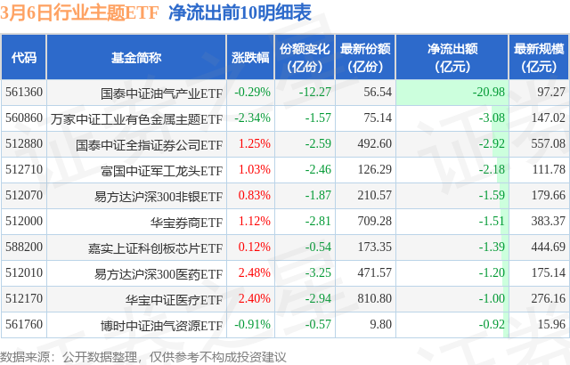 当日有141只行业主题ETF基金出现资金净流出,其中净流出排首位的是国泰中证油气产业ETF(561360),份额减少了12.27亿份,净流出额为20.98亿元。